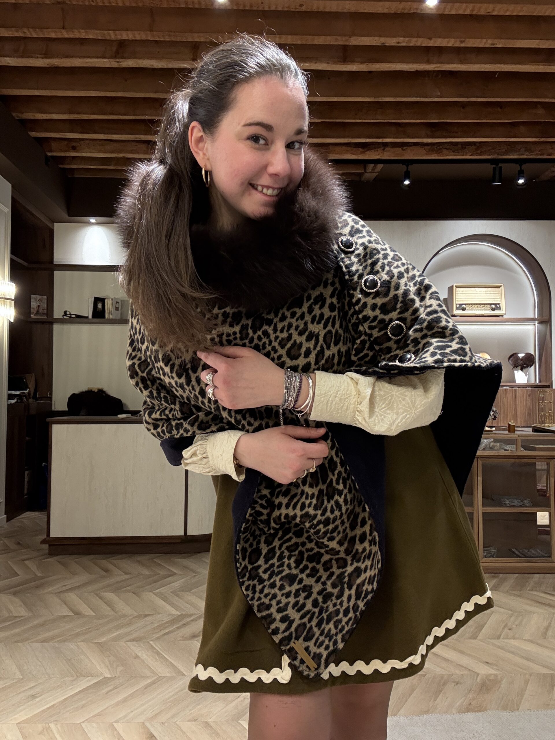 Vous choisissez un lainage “uni” pour s’associer avec le lainage léopard beige. Ainsi votre cape est réversible et vous permet de multiplier les possibilité de look. D’un tour de main retourner votre cape !