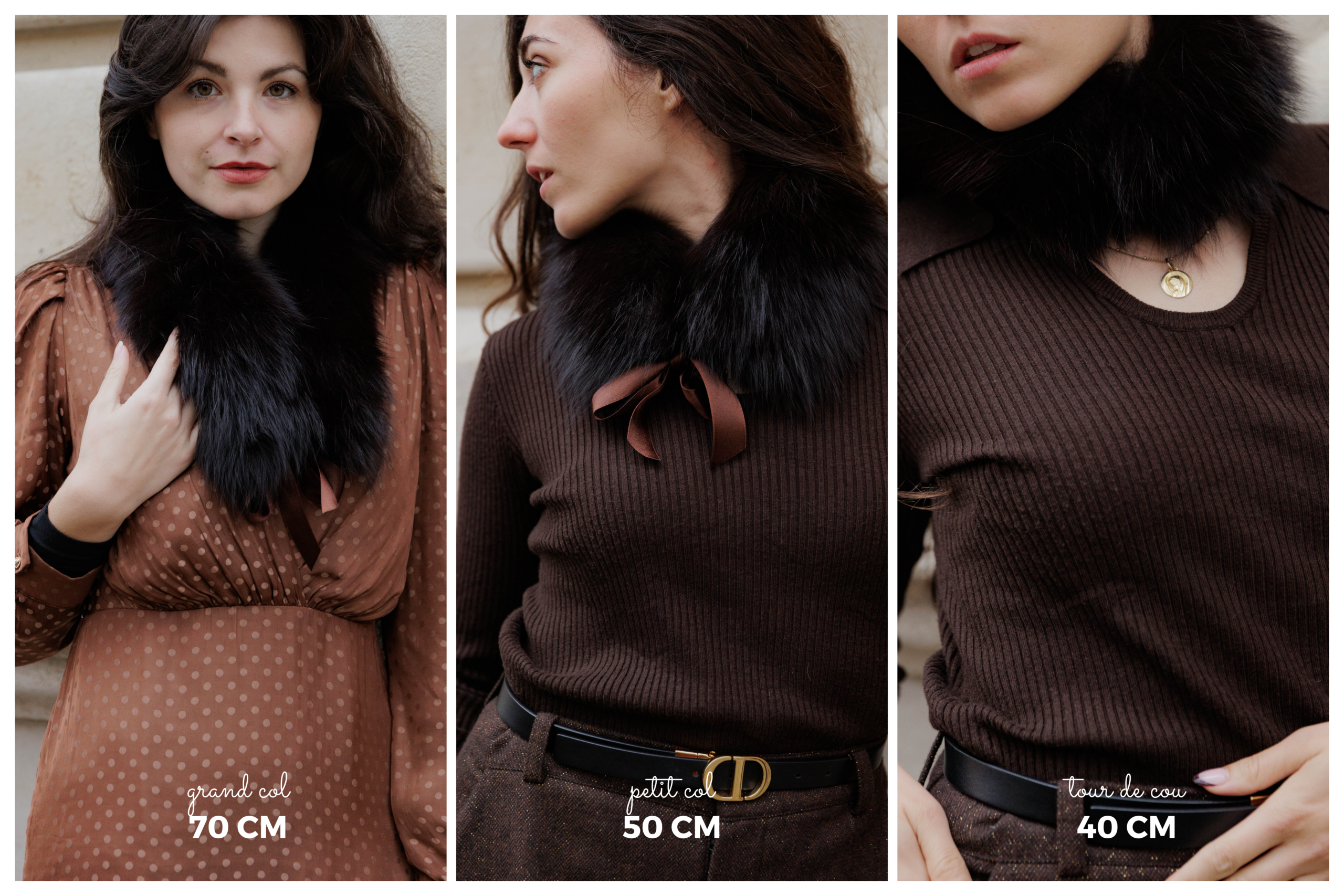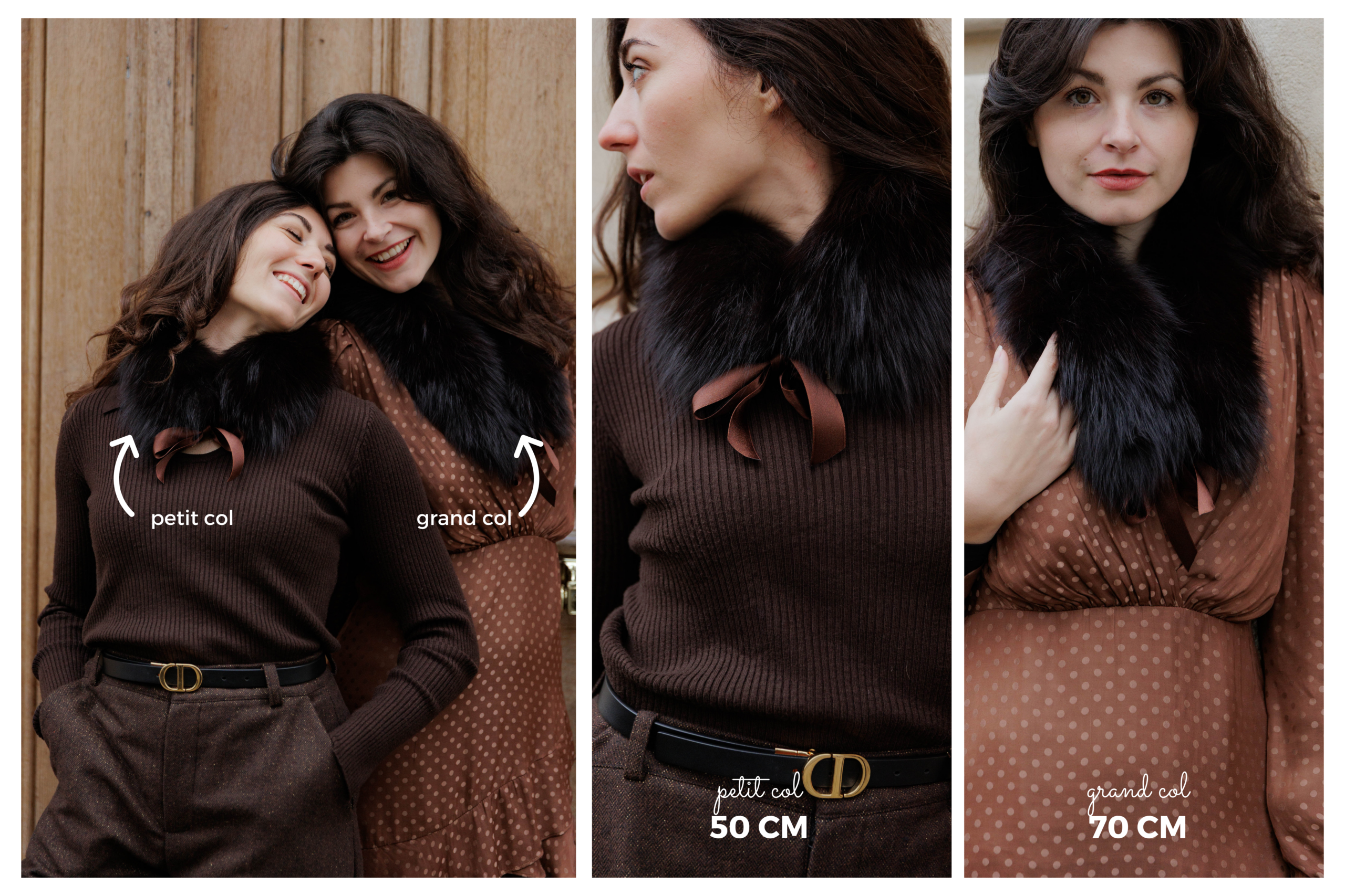Le col en fourrure de renard brun est une pièce iconique de la marque. C’est un intemporel, une valeur sûre de votre dressing d’hiver. Le brun foncé de cette fourrure s’accordera facilement avec votre garde robe d’hiver avec élégance et finesse. Des variations de couleurs sont possible d’une fourrure à l’autre car il s’agit de vraie fourrure de renard. Le col est doublé dans un popeline de coton au motif tartan, possède des anses de satin pour y glisser twilly, foulard ou ruban, et s’accroche avec des attaches invisibles, certains modèles (petit et grand col) ont des rubans de satin cousu pour nouer votre col. Cette fourrure est disponible en trois tailles :