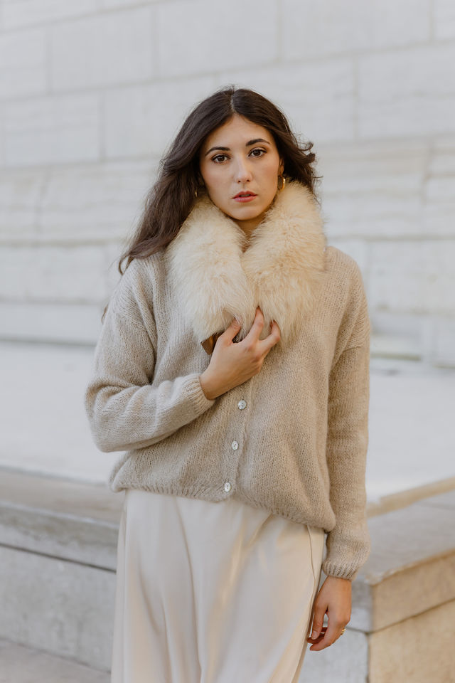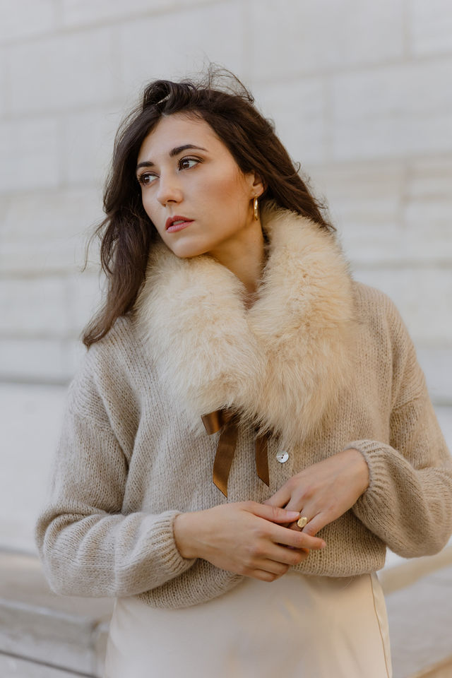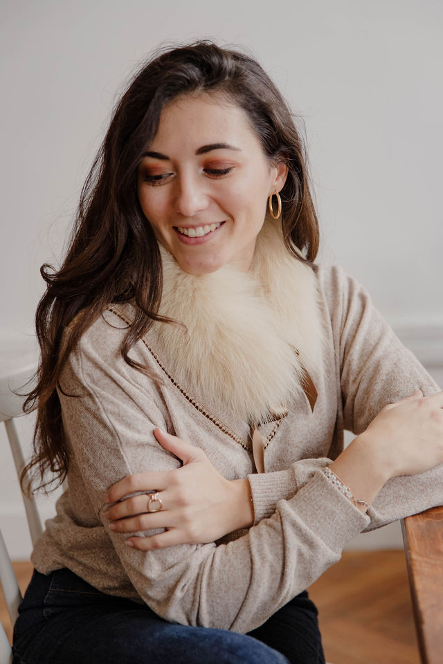 Le col en fourrure de renard Crème est une pièce limitée de la marque. La couleur crème de cette fourrure adoucira vos tenues et illuminera votre visage.