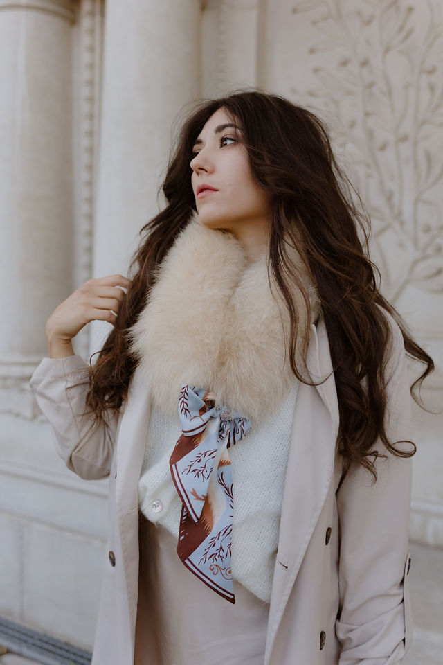 Le col est monté sur une doublure en coton, motif tartan iconique. Une attache invisible vous permet d’accrocher votre col en toute sécurité comme une agrafe. Un ruban en satin vous permet de nouer votre col en fourrure de manière élégante. Je vous propose deux tailles de col en fourrure, le petit col en 50cm qui se porte près du cou et le grand col de 70cm qui se porte en V plus long. Chaque col est différent au vu de sa provenance animale, il peut y avoir de légères différences entre les photos et votre col au niveau des couleurs. La nouvelle amélioration (2025) sur les cols en fourrure est des anses en satin cousu en plus aux extrémités du col, sur la doublure, vous permettant d’y glisser foulards et twilly pour apporter couleur et élégance à vos tenues.