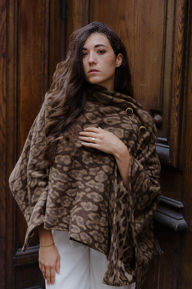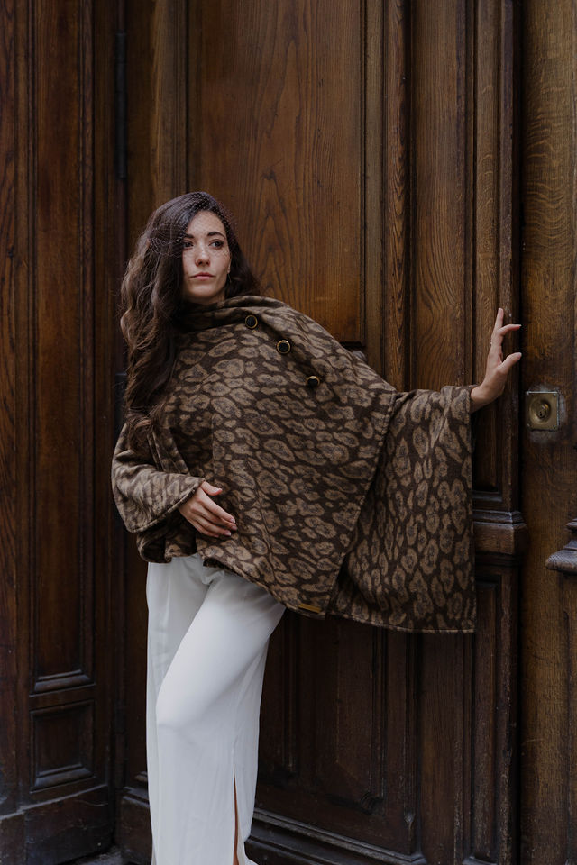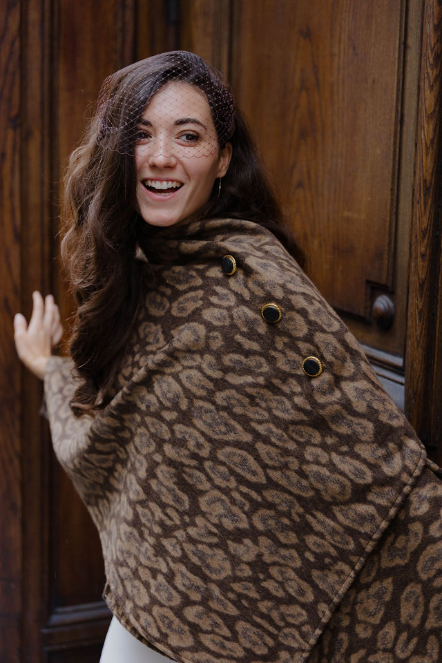 Un nouveau modèle, à mis chemin entre la cape et le châle, fait son apparition dans la penderie hivernale du Carnet d’une couturière : “la cape drapée”. Pour cette toute nouvelle version courte, nous avons sélectionné un lainage léopard beige, gris et marron. Les boutons macaron doré et gris apportent élégance et raffinement à cette petite cape drapée léopard moderne et citadine. La personnalisation des boutons est possible sur cette co-création.