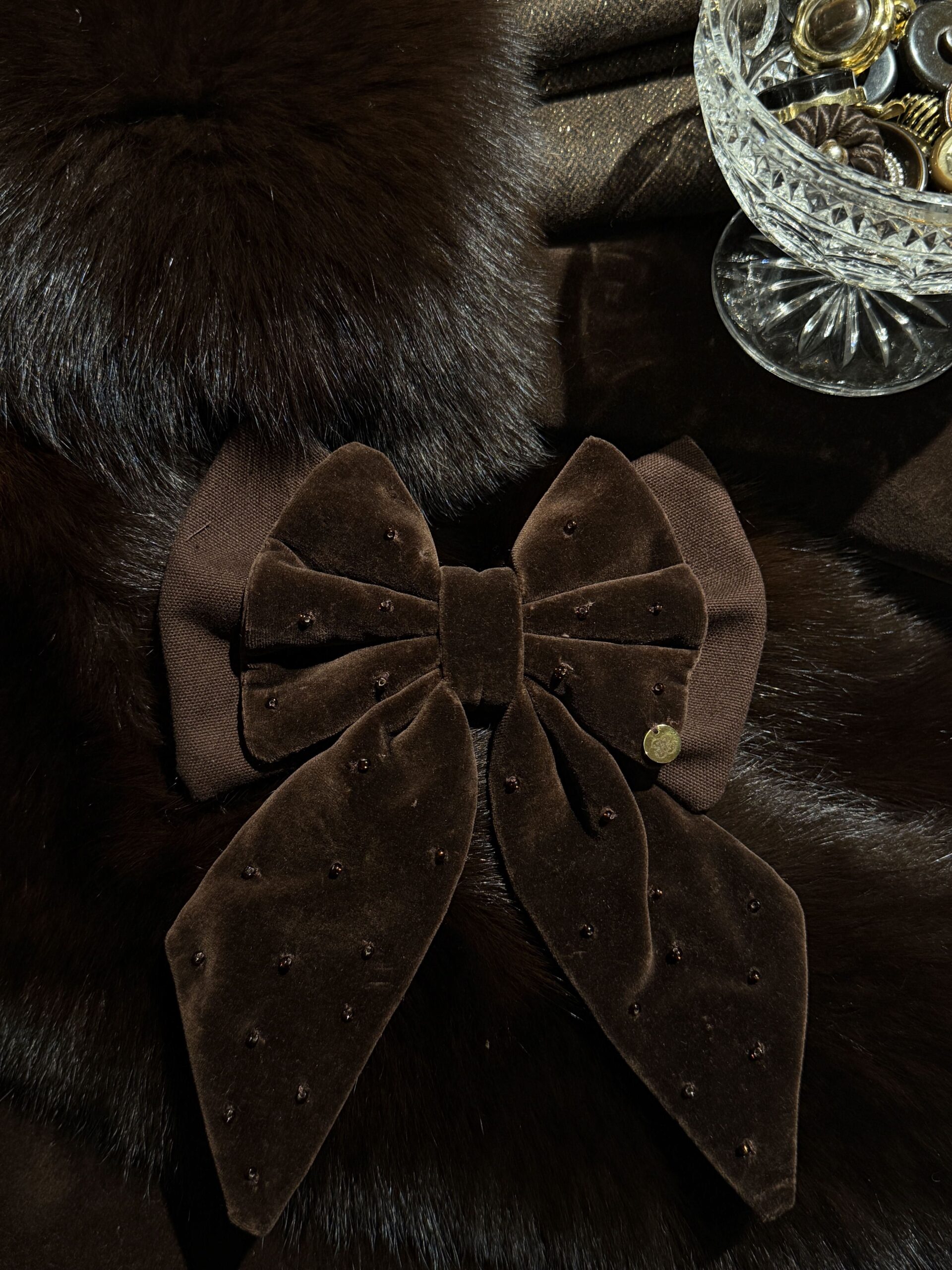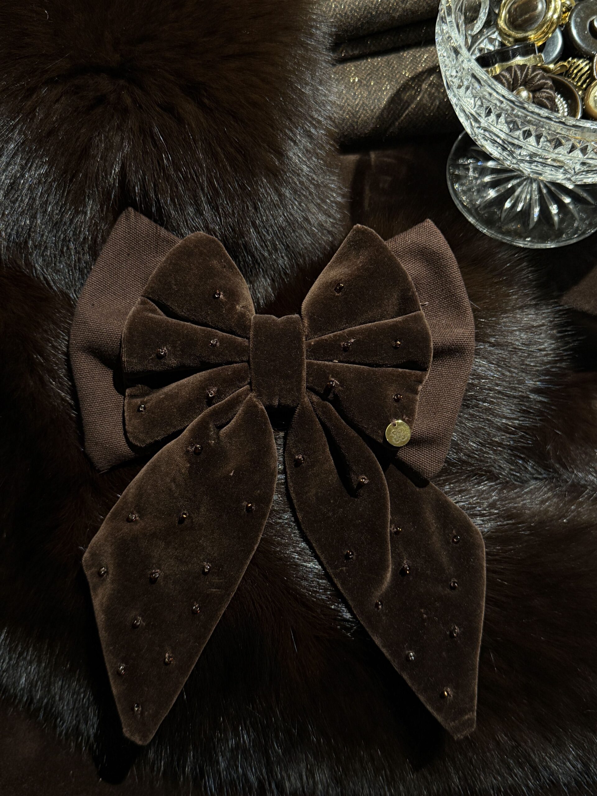 Un création unique, velours brun de la collection Paris Élégant, le noeud se distingue par ses perles cousue à la main pour apporter éclat et finesse à votre chevelure . Le noeud est disponible uniquement en grande taille. En espérant qu’il deviendra votre signature capillaire.